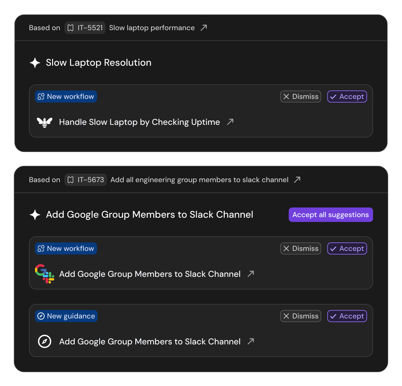 Serval Suggestions drafts automations based on ticket resolution. As your team closes tickets, Suggestions learns the pattern and proposes fully built workflows you can approve and ship with a single click.