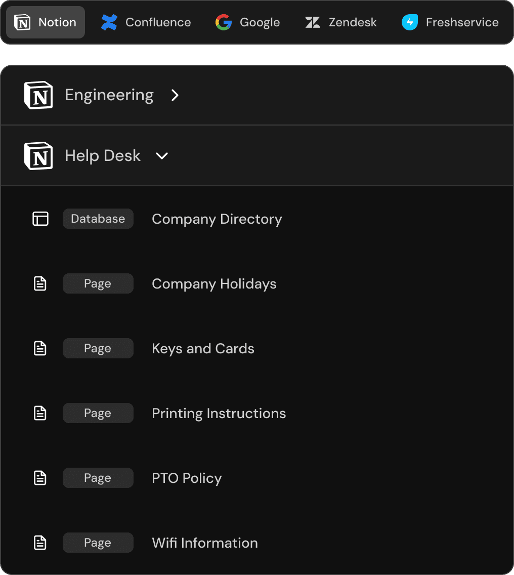Ingest company context into Serval by syncing Notion, Confluence, Google Drive, and more. Choose exactly which folders and files to include so Serval can resolve requests with your real processes and policies.